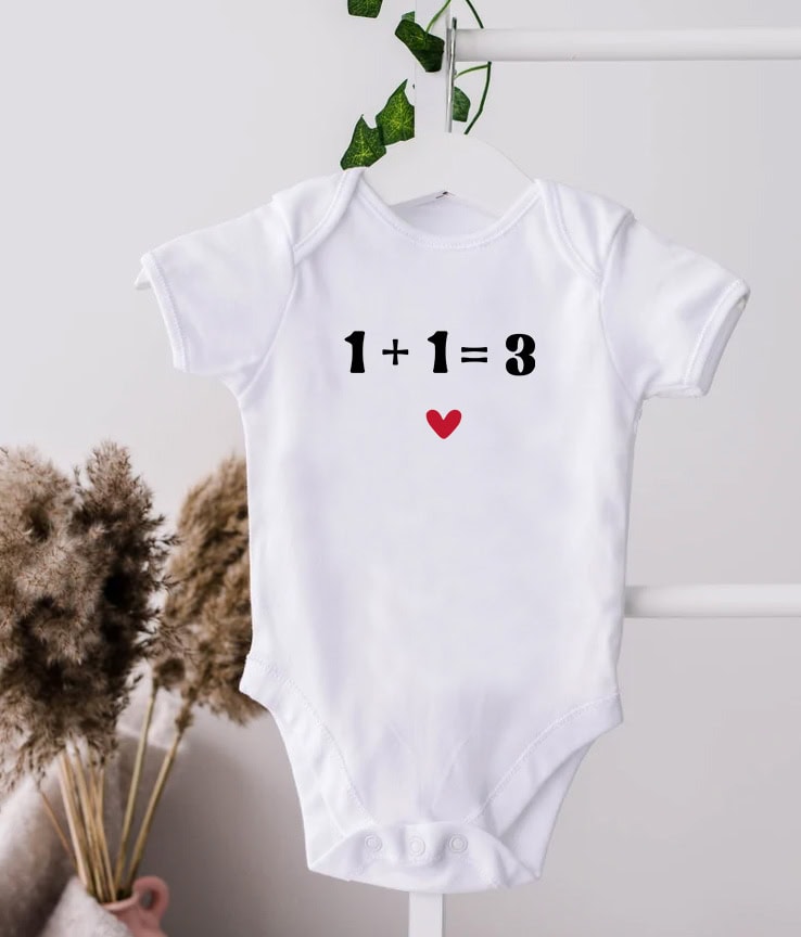 Le design épuré avec l’équation « 1+1=3 » illustre de façon ludique et ingénieuse l’addition magique qui annonce votre grossesse. L’ajout d’un cœur rouge, symbole universel de l’amour, donne vie à cette annonce et met en avant l’affection et l’excitation d’accueillir une nouvelle vie. Ce body est personnalisable, vous permettant d’ajouter votre propre touche créative pour une révélation encore plus unique et personnelle.