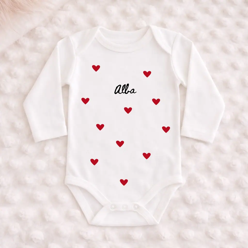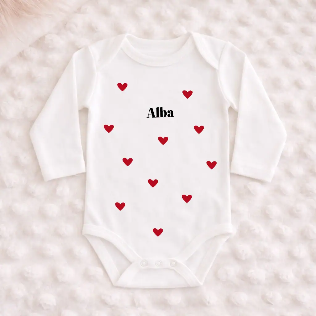 Un body naissance personnalisé rempli de cœurs rouges, pour un départ dans la vie tout en tendresse.