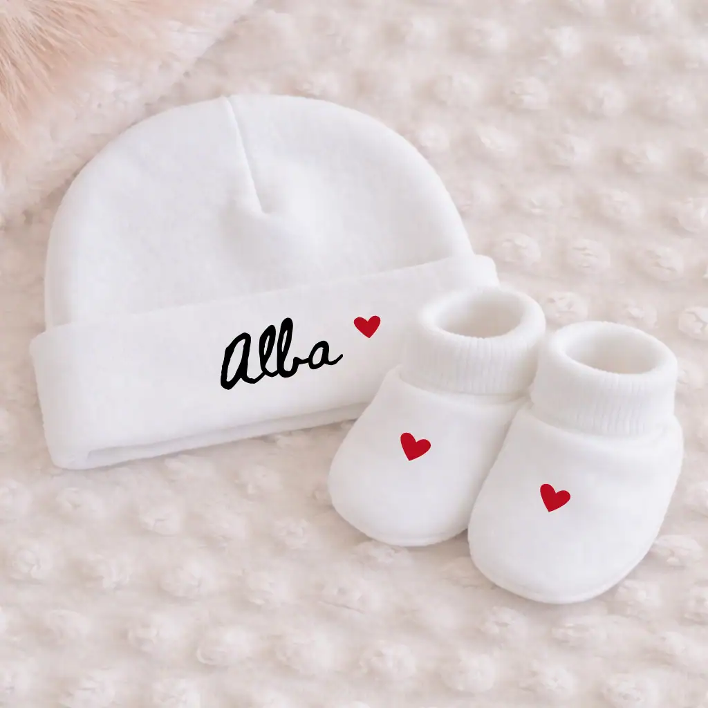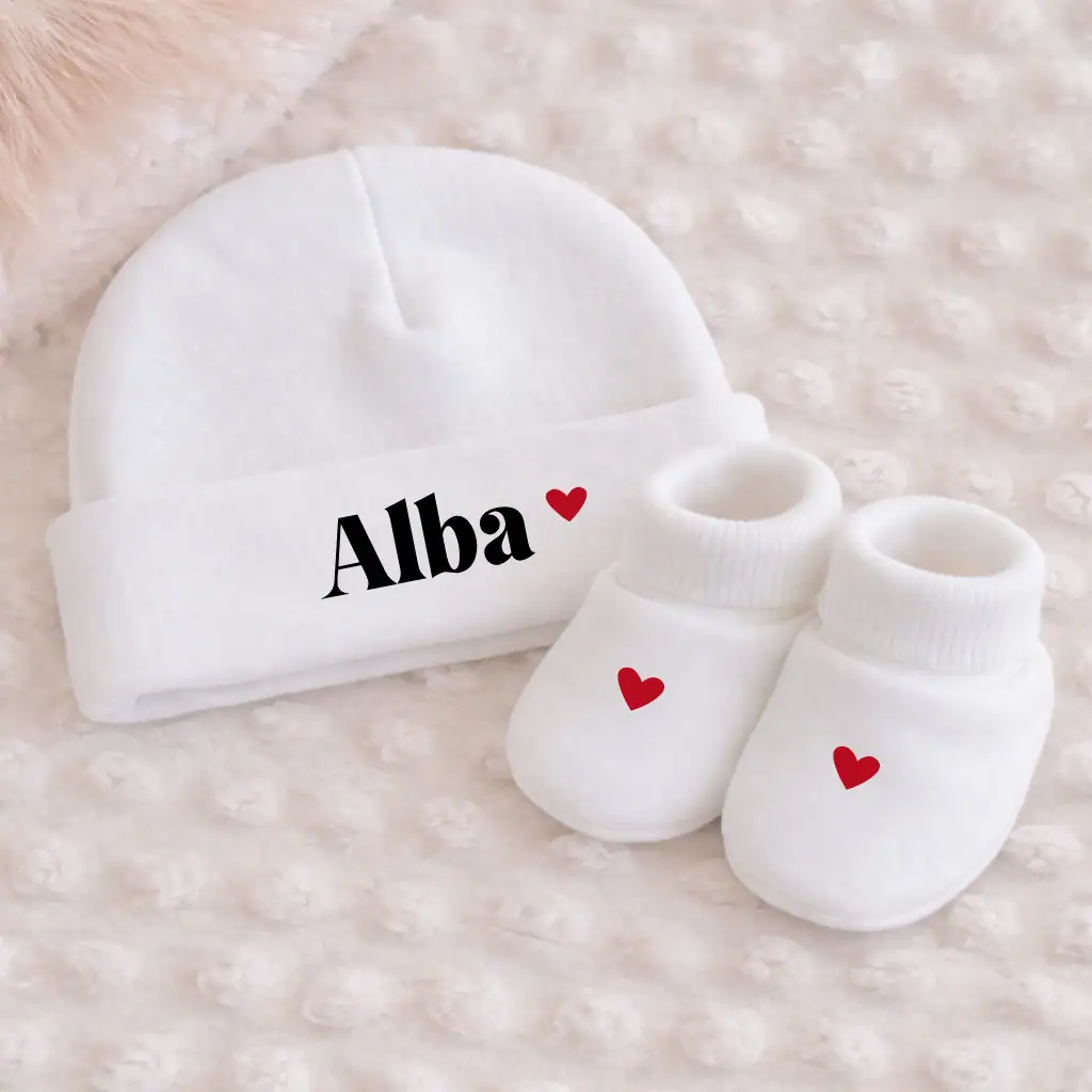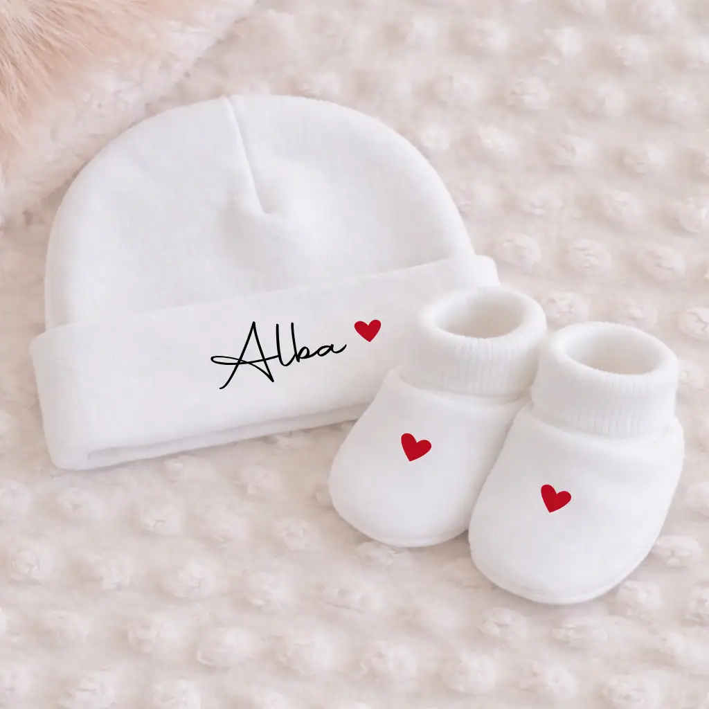 Ensemble naissance personnalisé bébé – bonnet + chaussons avec prénom et petit cœur (idée cadeau de naissance)