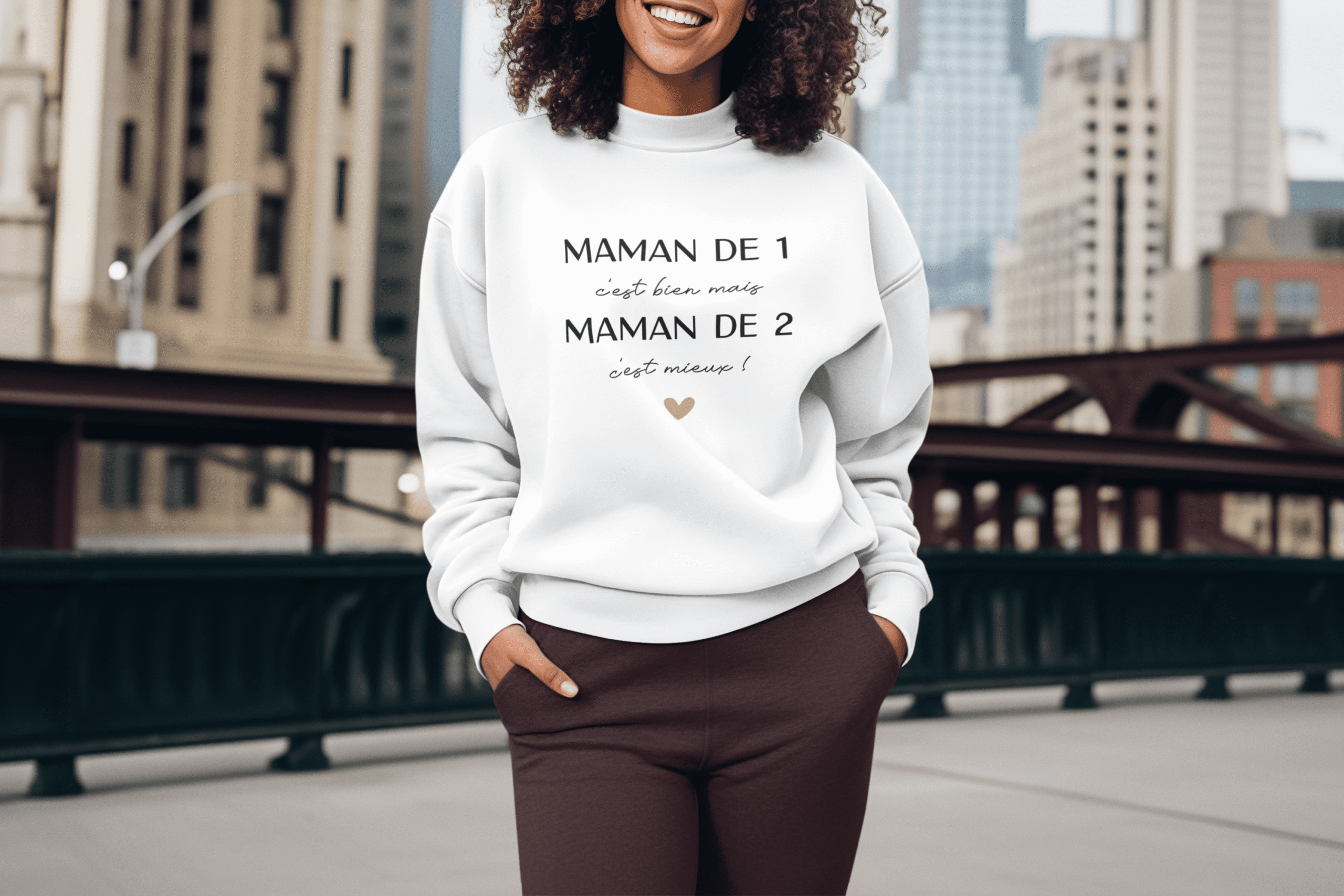 Avec son message espiègle « Maman de… c’est bien mais maman de… c’est mieux », ce pull annonce grossesse crée la surprise parfaite. Imaginez les regards complices, les sourires qui s’élargissent progressivement quand vos proches comprennent enfin. Plus qu’un simple vêtement, c’est votre complice pour révéler cette nouvelle extraordinaire avec style et tendresse. Sa coupe unisexe s’adapte parfaitement à votre silhouette, tandis que sa confection soignée vous accompagne tout au long de cette période unique. Disponible en blanc classique ou noir élégant, il se glisse naturellement dans votre garde-robe quotidienne. Vous pourrez même le conserver précieusement comme souvenir de ce moment si particulier.