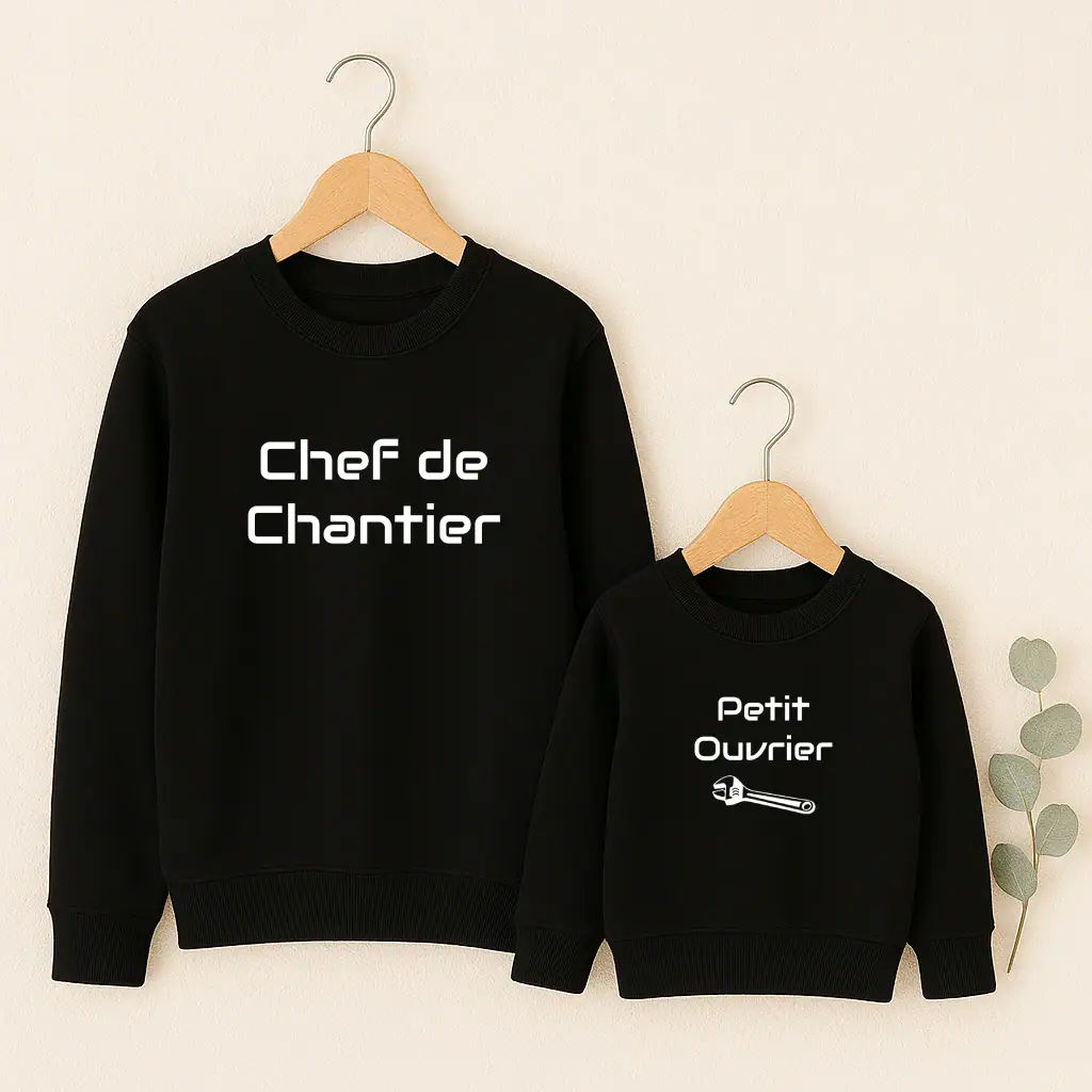 Papa arbore fièrement son statut de « Chef de Chantier » pendant que son petit bonhomme affiche son rôle de « Petit Ouvrier » avec la même assurance. Cette complicité vestimentaire crée instantanément une atmosphère chaleureuse où les regards attendris se multiplient. Que ce soit pour une sortie au parc, un week-end détente ou simplement pour partager un moment cocooning à la maison, ces pulls coordonnés renforcent naturellement les liens père-enfant. La coupe classique convient parfaitement aux deux générations, tandis que les inscriptions amusantes déclenchent sourires et conversations. Un choix malin pour les papas qui aiment marquer leur territoire avec humour tout en créant des connexions authentiques avec leur progéniture.