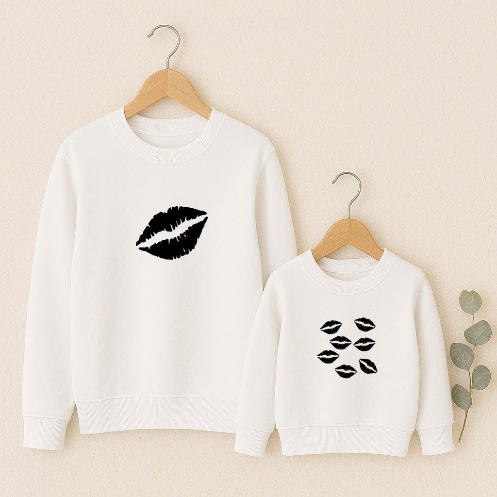 Porter ce pull, c’est montrer que l’amour parental se vit dans les petits gestes, les bisous volés, les câlins à répétition. La bouche imprimée sur le sweat adulte devient une source inépuisable de bisous, tandis que celui de l’enfant, recouvert de marques d’amour, rappelle à quel point il est chéri au quotidien. Ce vêtement est à la fois fun, symbolique et rempli d’émotion, parfait pour réchauffer le cœur autant que les épaules.