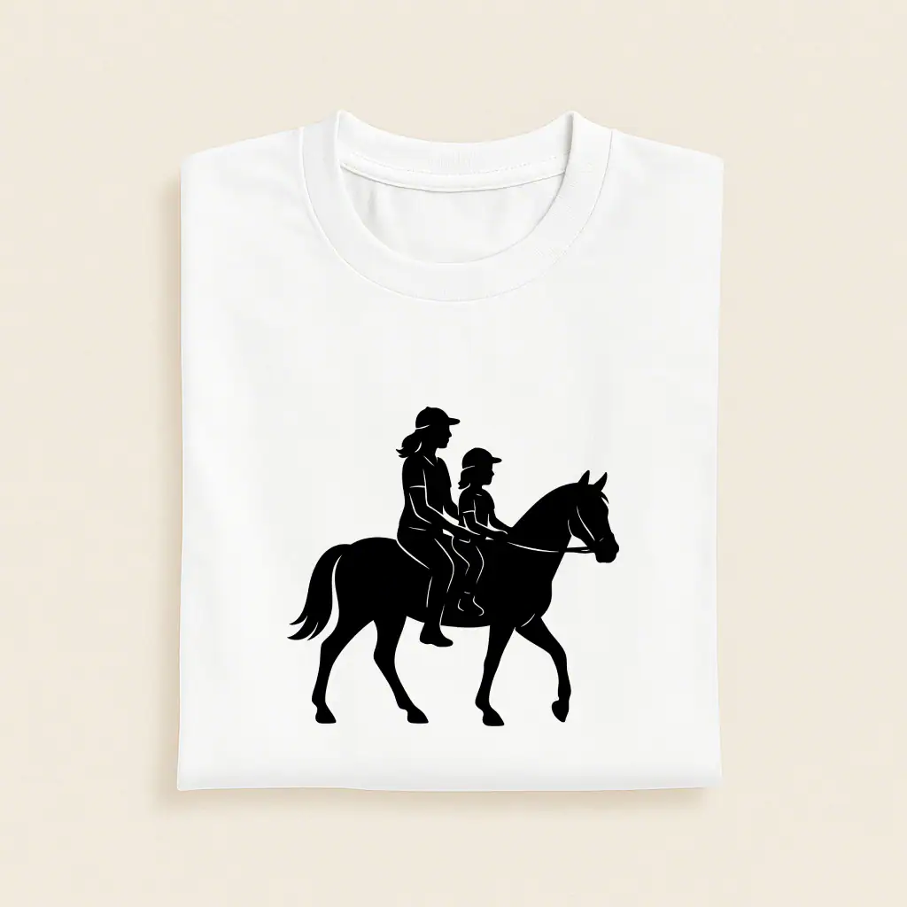 Rien ne vaut ce moment magique où maman et sa petite cavalière portent leurs tenues assorties avant de partir aux écuries. Ces t-shirts révèlent instantanément votre passion commune pour l’équitation, créant une connexion visuelle touchante qui ne passe jamais inaperçue. Le motif équestre soigneusement pensé exprime votre amour des chevaux sans ostentation. Parfait pour vos journées au club hippique, les concours ou simplement pour afficher fièrement votre sport favori au quotidien. La coupe classique unisexe convient à tous les styles, tandis que le blanc intemporel se marie facilement avec vos tenues d’équitation existantes.