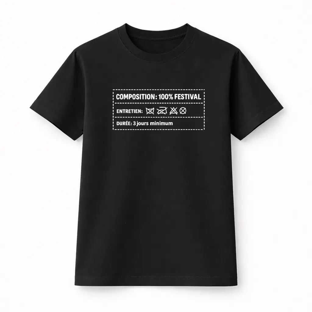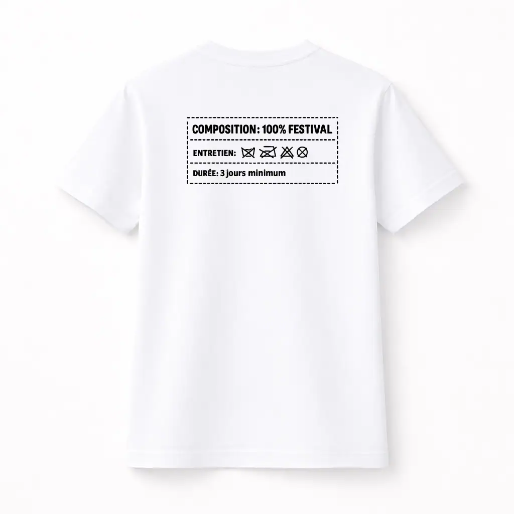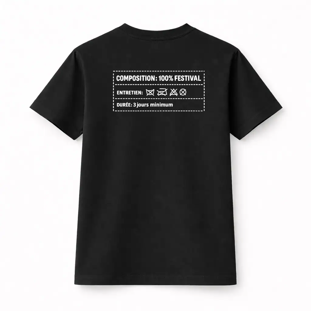 Conçu pour celles et ceux qui aiment jouer avec les codes, ce modèle revisite l’étiquette classique dans un esprit festival unique. Le design se décline sur le devant ou dans le dos selon vos envies, créant un effet de surprise garanti. Sa coupe classique flatteuse convient parfaitement aux silhouettes masculines comme féminines. Disponible en blanc ou noir, il s’adapte à tous les styles vestimentaires et se marie facilement avec vos autres pièces festival. Plus qu’un simple vêtement, c’est un clin d’œil complice à tous les amateurs de musique et d’événements qui reconnaîtront immédiatement la référence.