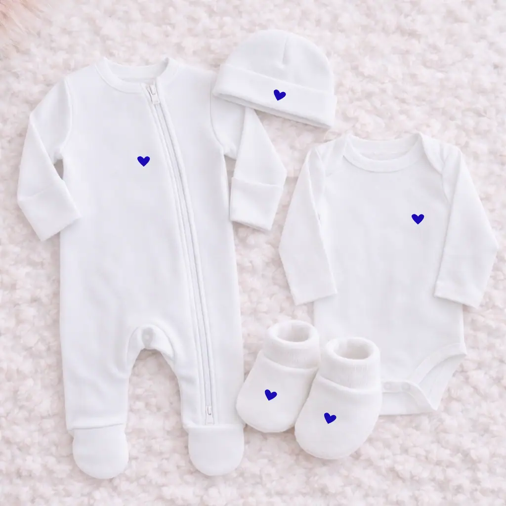 Une tenue naissance cœur bleu, douce, pratique et parfaitement assortie, pensée pour les premiers souvenirs et le quotidien.
