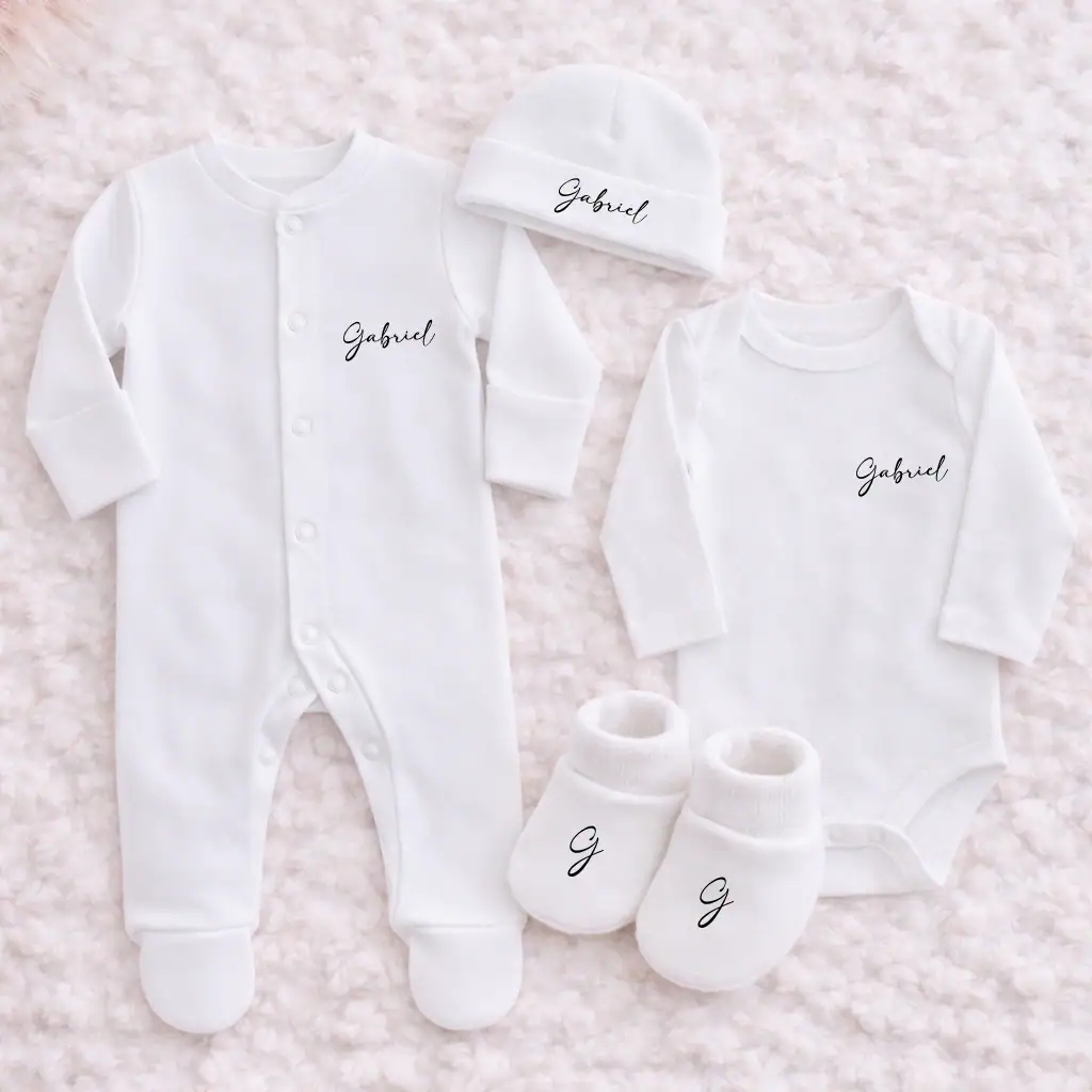 La personnalisation est raffinée et harmonieuse : une seule écriture est utilisée pour l’ensemble. Le prénom (ou un mot doux) est placé côté cœur sur le pyjama, le body et le bonnet, pour une tenue cohérente et élégante. Les chaussons ajoutent une finition adorable : la première lettre du prénom est inscrite sur chacun, comme une signature discrète.